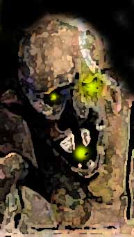 glimmade och en röd tunga gled ut mellan läpparna som på en orm. Och ögonen,