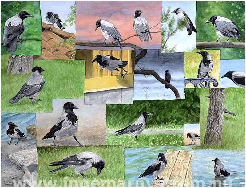 19 variationer/19 Variations | Akvarell/Watercolor | Fåglar MENY | Såld/Sold Grå kråka/Hooded Crow | Corvus corone cornix | FAKTA OM KRÅKA 070 994 15 38 | M@IL