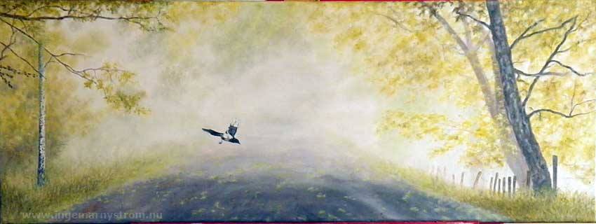 Lämnar grenen/leaving the branch | Olja/Oil | 25, 5 x 80 cm | Pris 6 000 skr Skata/Magpie | Pica pica | Fåglar MENY Fi: Harakka Fr: Pie bavarde 070 994 15 38 | M@IL